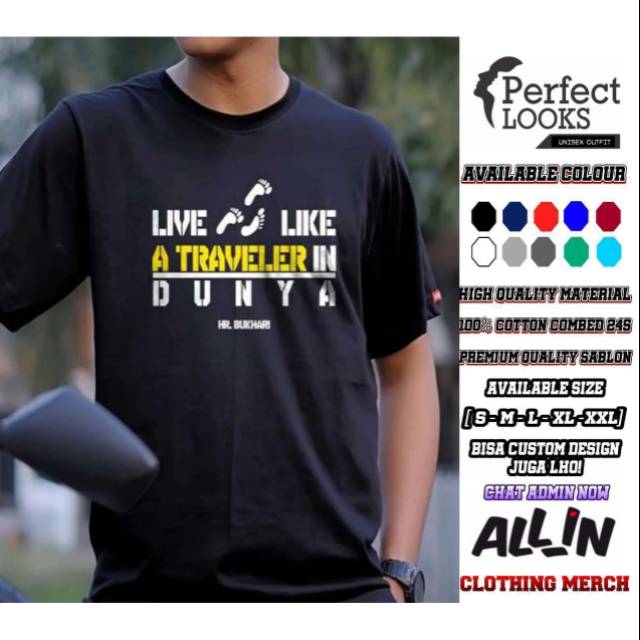 Kaos Kata Bijak Live Like A Traveler In Dunya H R Bukhori Desain Jejak Kaki Baju Pria Keren