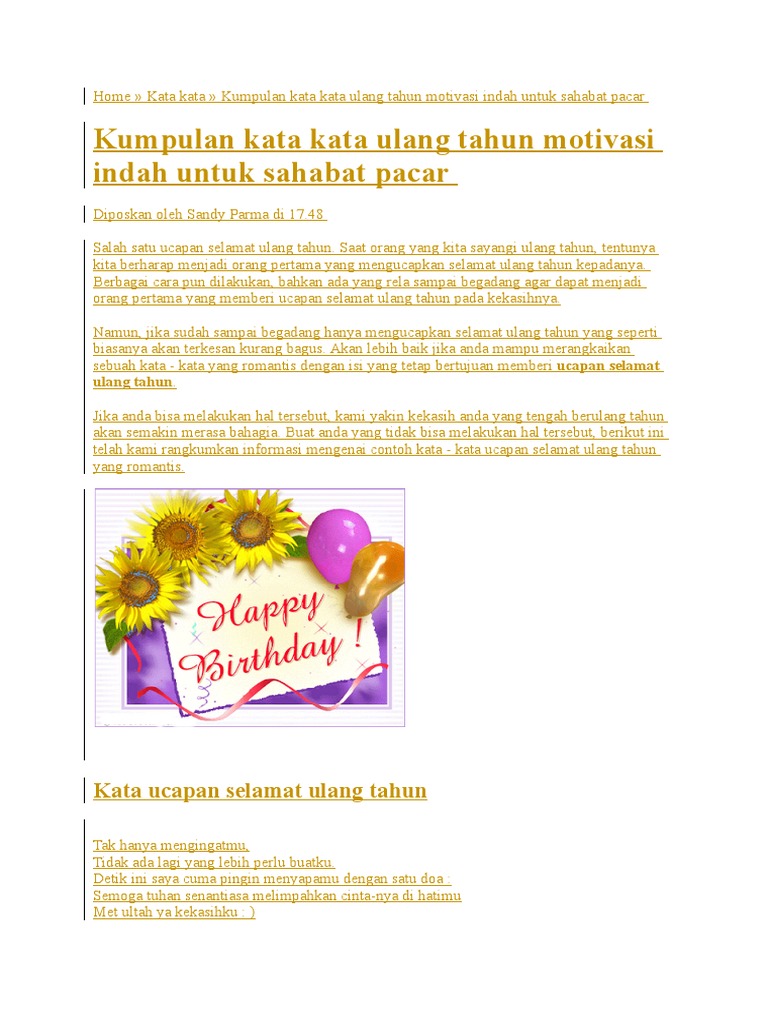 Semoga ucapan selamat ulang tahun ini dapat membuat pacar sahabat teman atau kawan kita merasa termotivasi senang dan bahagia. Kata kata indah untuk yang pacaran jarak jauh hubungan sebuah. Kata kata ucapan selamat ulang tahun ini bisa anda gunakan untuk meng ucapan selamat ultah untuk pacar sahabat teman sodara dll.