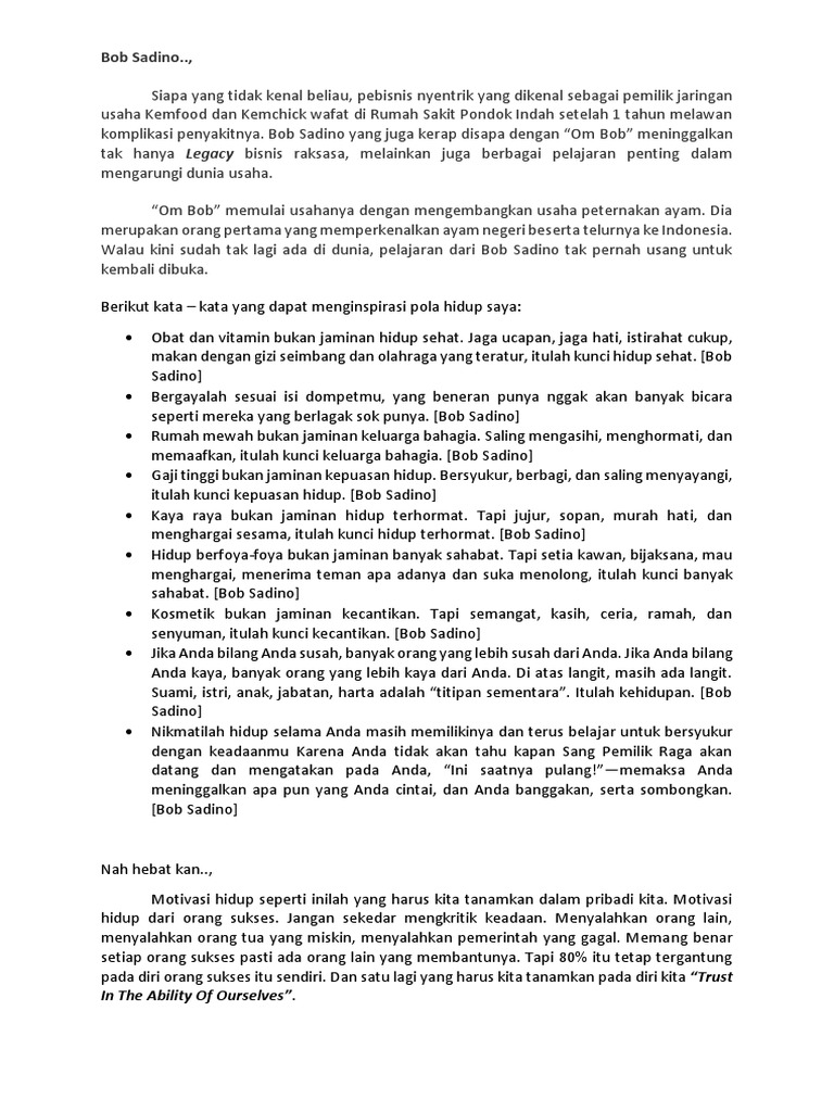 Sebagai pelaku bisnis pemula kita harus yakin bahwa kesuksesan bukanlah ditentukan oleh nasib. Maklum sebagai wirausaha kecil di sektor jasa kadang saya merasa masih seperti pengusaha pemula. Bob sadino adalah seorang pengusaha asal indonesia yang berbisnis di bidang pangan dan peternakanwalau kini sudah tak lagi ada di dunia pelajaran dari bob sadino tak pernah usang untuk kembali dibuka.